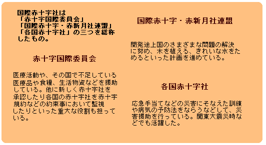 さあ、国際赤十字社について説明するよ。 日照りが続いたことにより、食糧不足におちいったり、栄養不良で多くの人が 死んでしまったりした地域もあったんだ。人々の健康を守るため木を植えるな どの活動もかかせないんだね。他にも現地で車椅子や医療器具の貸し出し、私 設保育園の運営などの活動も行っているんだ。 そうなんだ・・・そんな国があるなんて。 俺もなにか援助をしたくなってきました! BACK NEXT
