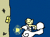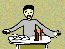 家へ帰ると、母は「李小、爆竹と蝋燭は買ってきたかい、お供えのお饅頭はあるかい」と聞きました。李小は、「いつもよりたくさん買ってきたよ、それにお饅頭もいっぱいあるよ」といって、おからで作った饅頭を十五個も並べ、松の根を蝋燭のように灯しました。そして李小は、「おっかさん、今年は福の神が真っ先にうちに来てくれるように早く爆竹を鳴らそう」といって外に行き、太い竹筒を棒でパンパン叩き、近所の爆竹が鳴り出すと負けずにもっと強くたたきました。