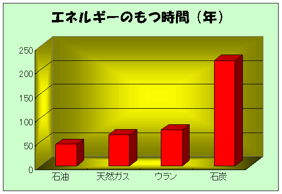 下のグラフを見て下さい。このグラフには、今まで通り人類がエネルギーを使ったとしたとき、あと何年持つかが示されています。石油は、45年、天然ガスは65年、ウランは75年分、石炭は220年分と言われています。