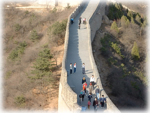 有名な建築物の一つに、万里の長城(ばんりのちょうじょう)という名前の通り、とても長い建物があるよ。当時、外から敵が侵入するのを防ぐために作られたもので、とりでのような役割を果たしていたんだ。その万里の長城は、宇宙からも見る事ができるほど、大きな建物なんだ。すごいね。