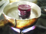 | ○その2 コップをなべに入れ、沸騰しない程度に十分ほど煮出します。 液が紫色になってきたら、茶こしなどでキャベツをこします。 残った液がムラサキキャベツ液です。 |