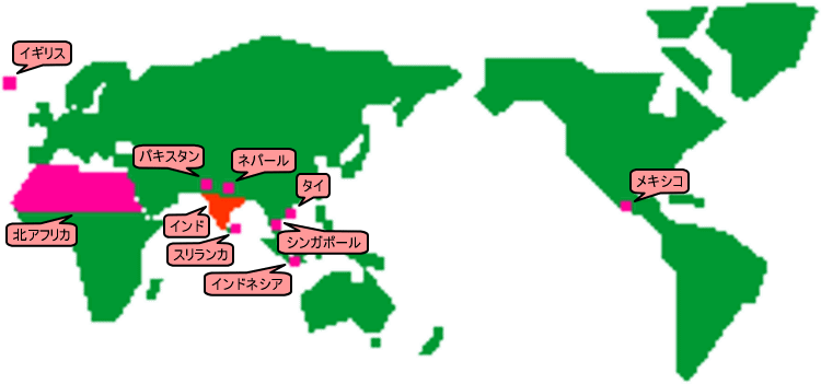 世界のカレーをいくつか紹介します。この他にもカレーに似た料理を食べる国はたくさんありますが、ここでは代表的なものをあげます。地図上の国にカーソルをあわせてクリックしてみてください!