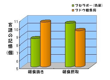 2. 朝食を食べたグループと朝食抜きのグループに分けて、ブドウ糖を与え、言葉に関するテストを行った。朝食抜きのグループでは、ブドウ糖を摂取した人のほうが頭の回転が速く、どんどん言葉が出てきた。(グラフ参照)