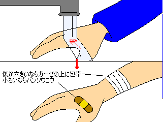 @汚い手で触れないようにする。 A傷口が汚れていることが多いので、水道水など(流水)で 十分に洗い流します。 B傷口に消毒ガーゼを当て、包帯をしておけば 傷口が小さい時は、ばんそうこうを貼る)自然に治ります。