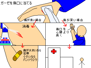 浅い傷 @ガーゼなどの清潔なものを傷口に当て、軽く抑えて止血する。 軽い出血は2〜3分で止まる事が多い。 A消毒薬で消毒する。 十分に洗い流します。 Bガーゼを傷口にあて、ばんそうこうを貼るか包帯を巻いておく。 深い傷 @ガーゼを傷口に当て、強く押さえて止血する。 A傷口を強く押さえたまま、傷のあるところを心臓よりも高くする。 B出血がひどいときは止血点も圧迫する。 Cガーゼの上から包帯をまいて病院に行く。