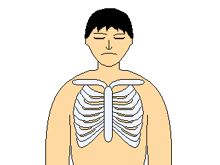 @傷病者を仰向けに寝かせる。 A手の人差し指と中指を傷病者のわき腹に置き、 _ 一番下のろっ骨にそって、人差し指と中指でなぞり、 _左右の肋骨(ろっこつ)の出会う部分を確認する。 Bその部分から指2本あてた頭側の胸骨上が位置になる。