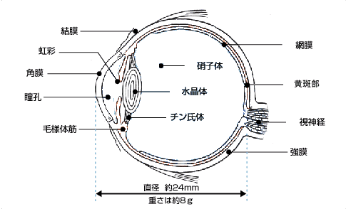 この間全くの 無色透明 であり、光を遮るもの は何もありません。 又、光が目に進入すると、角膜と水晶体の 持つ強い屈折力によって、網膜上の 黄斑部 (おうはんぶ)で焦点が合う構造になっています。 網膜上に写し出される像は、実際とは逆の映像となり、網膜から視神経を経て大脳へ届き、 逆さの像を修正して視覚としてとらえています。 |