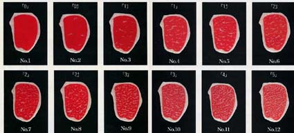 ロース芯および周囲筋の状態での審査でBMS(ビーフ・マーブリング・スタンダード)No.という基準で12段階に区分されます。