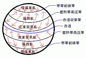 極地方と赤道地方とで温度差を生じる結果、このようにいろいろな風が出来ます。