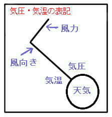 詳しい天気図では、天気記号の左肩に気温、右肩に気圧を書き表している場合があります。