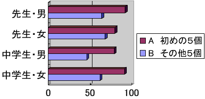分析1] 初めに見せた単語5個は、覚えようとは思わずに見ていただけの人が多かったようです。しかし、いざ虫食い問題をとこうとすると、Aの単語が出てきやすいという現象『知覚表象システム』がおきました。だから、ほかの単語BよりAの方が正解率が高いのです。 | |||||||||||||||