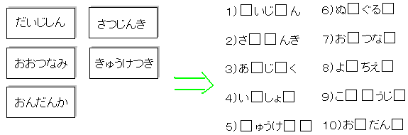 方法]5枚の紙に書かれた5つの単語を、20秒間見せる⇒ほかの単語5個を加えた虫食い単語問題を解いてもらう(60秒間) ![]() | |||||||||||||||