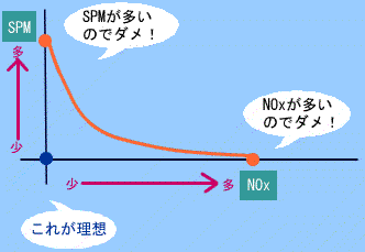 長所…燃費がいいため二酸化炭素の排出量が少ない 耐久性がある 短所…SPM(黒煙)を排出する NOx(硫黄酸化物)の排出量が多い 三元触媒によって有害物質の排出を抑えられない |