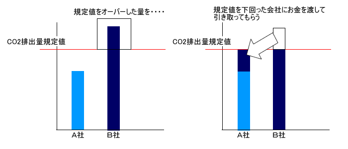 京都議定書で CO2 の削減が迫られる中、対策の一つとして 、アルが先ほど言っていた二酸化炭素の排出権取引というものがあります。二酸化炭素など地球温暖化の原因とされるガスを排出する権利を、国や企業の間で売買する仕組みです。 例えば、 A 社と B 社がいたとします。 A 社は環境問題に積極的に取り組んでいるため、設備の改善等をしてCO2の排出量を軽減させることに成功しました。一方 B 社は環境問題の対策を怠ったため、規定値よりもCO2の排出量が上回ってしまいました。そこで、 A 社は自分の規定値よりも下回った排出量を B 社に売って、逆に B 社が上回ってしまった排出量をもらいます。 A 社は環境問題に取り組むことによってさらに利益を上げることができるのです。