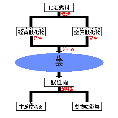 ○ ![]() 皆さんはきっと「酸性雨」という言葉を聞いたことがあるでしょう。 実は酸性雨の大きな原因は 化石燃料を燃やすことにより二酸化炭素のほかに、 それらが雲に 硫黄酸化物や 窒素酸化物が溶けた雨は強い酸性で、それが石像などにあたるとそれを溶かしてしまいます。 また土や湖、沼に酸性雨が溶けるとそれらを酸性化させて、 木を枯らせたり、湖や沼にすむ生き物たちが死んでしまうそうです。 木が枯れると、二酸化炭素が増加することになりますから、 酸性雨は地球温暖化を 次は温暖化に関連した問題である「砂漠化」についてです。次へ進みましょう。 |