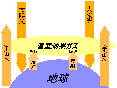 「温室効果ガス」とは太陽から受けた熱の一部を空気に貯めておく効果をもっている気体のことです。