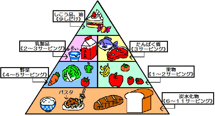 しいですね。下の図はアメリカで考えられた「フードガイドピラミッド」を日本人向けにアレンジした健