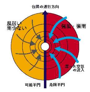 台風は巨大な空気の渦巻きで、地表付近では中心に向かって反時計回りに強い風が吹き込んでいます。そのため、進行方向に向かって東側の半円では、中心に吹き込む風と台風を移動させる風(一般流)が同じ方向に吹くため風が強くなります。逆に西側の半円では、吹き込む風と一般流が逆方向になるので、右半円に比べると風速がいくぶん小さくなります。よって、東半円を「危険半円」、西半円を「可航半円」と呼びます。