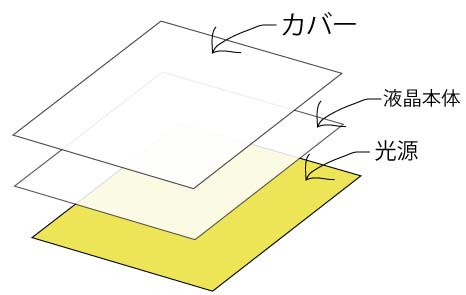 液晶の構造について極めて略式ですが、図をご覧いただきたいです。 まずは光源が光を発します。そして固体と液体の中間状態の物質である液晶をフィルターとして使うことにより、RGBに分けて色を表現するわけです。 長所としては消費電力が少ない点、薄型、野外での可視性に優れている点などが上げられます。 逆に短所として残像が発生しやすい点、視野角に限りがある点、またバックライトによるコントラスト比の低下などがあげられますが液晶技術の向上によって改善がほどこされているものもあります。 図