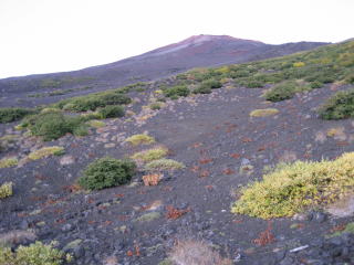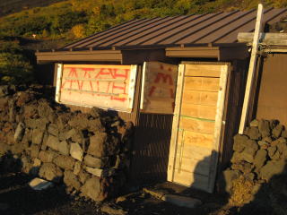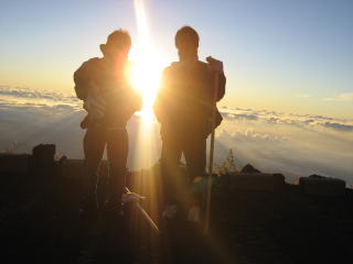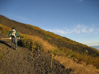 | 富士山登山記 〜本六合目〜 2008年10月12日(日) 06:02 本六合目到着 須走口本六合目 標高2700m ![]() 14分遅れでの到着となった。 本来ならここからご来光を見る予定だったが、それは叶わなかった。 だが、急ぎすぎないこのくらいのペースが一番いいのかもしれない。 焦って登るのは大変危険である。急な高度上昇に体が耐えられなくなり、高山病になる恐れがあるからだ。 ![]() 僕たちはひとまずここで小休憩をとることにした。2時間もぶっ通しで登り続けていれば、気付かないうちに疲労はかなり溜まっているはずである。 ここでは菊屋で一緒に宿泊し、僕たちよりも1時間半前に出発した大学生4人組に早くも追いつき、少し会話を楽しんだ。 彼らが3時間半かけたところ、僕たちは2時間で登ったのだから、それがペースの早さを物語っている。 ![]() 10分くらいしたところで、再び出発。 ここまで来ると、さすがに疲れの色も隠せなくなってきた。 座って足を止めてしまったせいか、疲労がいっきに押し寄せてくる。 だがまだまだ先は長い。僕たちは会話をしながら、何とか気を紛らわせた。 そんな中、富士山の植生が徐々にではあるが変化していることに気づいた。 本六合目を過ぎたあたりから、五合目にあった大きな木は消え、草木が一面を覆うようになった。 ![]() ここまで高度が上がると、植物にとっては厳しい環境なのだろうか。 さらにジグザグに踏み固められた溶岩の道を登り続けると、徐々に草木はまばらに生えるだけになり、溶岩で覆われた地面が見えるように。 ![]() これが火山灰に覆われた山である。 ![]() こういった細かいことに気づかさせてくれることも、大自然の魅力の一つだろう。 それにしても今日は登山日和だ。この雲ひとつ無い快晴。 ![]() 一本のストックを友に、歩き続けて3時間。ついに中間地点、七合目が見えてきた… ▼Back ▼Next ▼日記TOPへ |