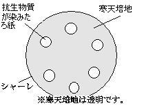 それぞれ違う種類の抗生物質を染み込ませ、同じくらいの間隔を開けて寒天培地の上に置きます。