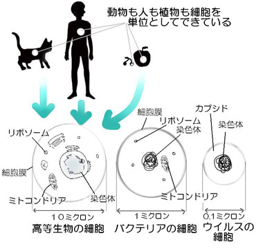 わずか直径一ミクロン(1000分の1ミリメートル)の小さな一戸の細胞しか持たない大腸菌であるが、リボソームやミトコンドリアを備えているから、栄養素さえ十分に与えられれば独立して生きていける。大腸菌は立派な立派な生物なのである。一方、膨大な数の細胞が寄り集まってできたヒト、動物、植物は多細胞生物であるから、大腸菌よりずっと進化した高等生物である。また、高等生物の細胞の直径は大腸菌の10倍で、約10ミクロンもある。