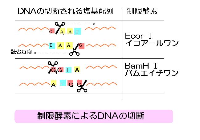 制限酵素はシークエンスの特別な文字配列を呼んで切る。たとえば、イコアールワンはGAATTC、バムエイチワンはGGATCC、ハエワンはGTTAAC、という6文字を見つけて素早く切る。