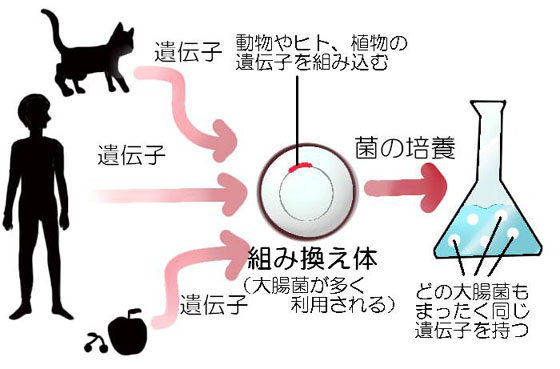 ある生物の遺伝子を別の生物に移すこと、具体的に言うと、ヒト遺伝子を大腸菌などのバクテリア(細菌)やネズミに移したり、バクテリアの遺伝子を植物に移すことです。