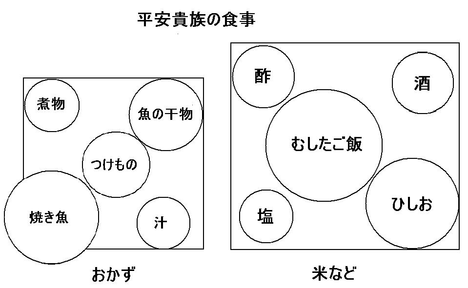 貴族の食事は、10時と16時の2回で、ご飯と鯉や鯛などの魚、野菜、鳥などのおかずと漬物などでした。 ご飯は強飯といいいっぱい高く盛り付けるようになっています。 しかし、ご飯といってもお箸を少しつけるだけで、ほとんど食べません。 庶民は玄米と漬物など貴族にくらべかなり質素なものでした。 |