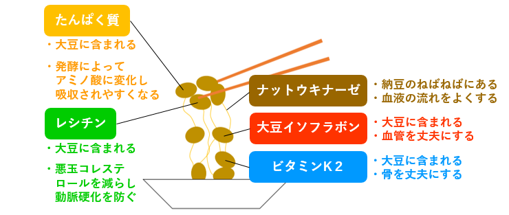納豆は主に大豆に含まれる栄養素と、ねばねば成分に含まれる栄養素があります。