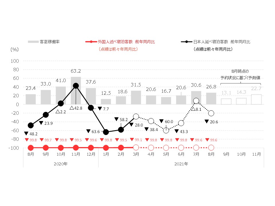 少し前の京都のホテルの宿泊客数の推移のデータですが、このようにコロナ禍前に比べた割合で見ると明らかにマイナスになっていることがわかります。
