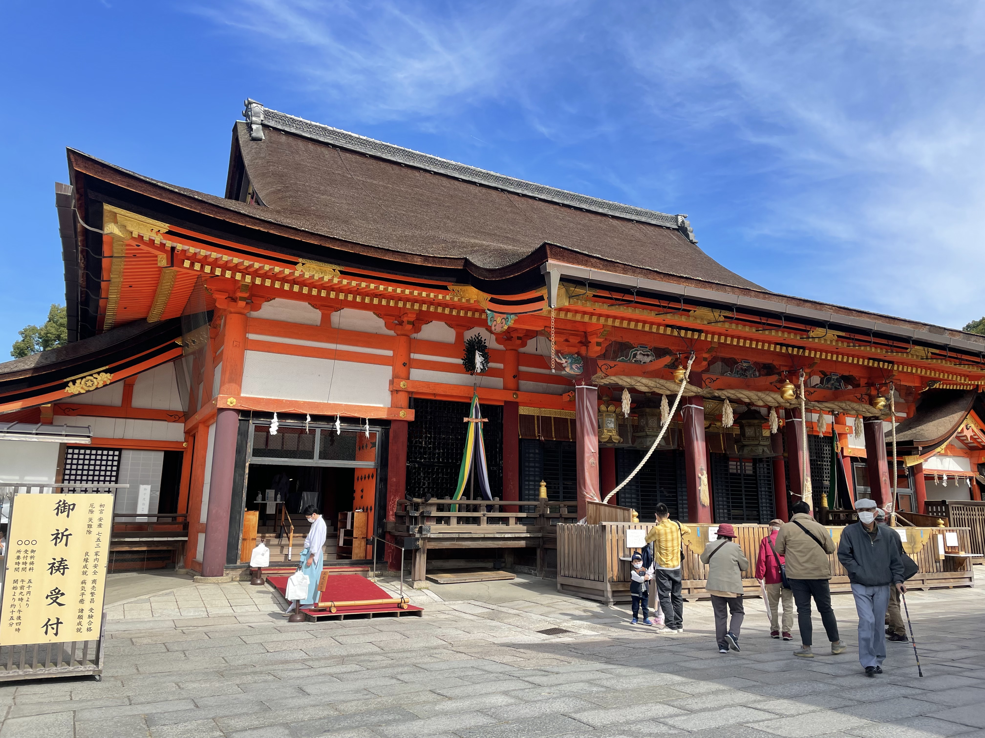 「祇園さん」として古くより京都の人々に親しまれ、本殿(国宝)をはじめ境内外に多数の摂社(せっしゃ)末社(まっしゃ)を有し、その多くが重要文化財に指定されています。