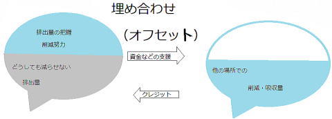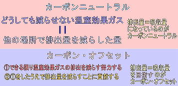 ![]() ![]() カーボンオフセットとは左の図のように 「①できる限り温室効果ガスの排出を減らす努力」をし、 ②「①をしたうえで排出量を減らす取り組みに貢献する」 ことで自分の出した温室効果ガスを少なくする取り組みのことです。 カーボンニュートラルとはカーボン・オフセットの取り組みをさらに深くさせ、 温室効果ガスの総排出量をそのほかの場所で埋め合わせをして 自分が排出した温室効果ガスを実質ゼロにする取り組みのことです。 |