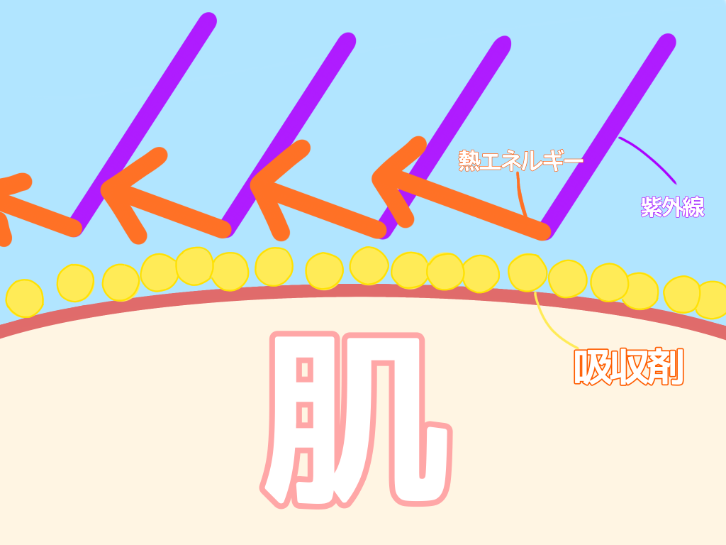 こちらは日焼けの原理に対応したもので科学の仕組みによって紫外線エネルギーを 吸収するタイプで、汗や水に強く崩れにくいのが特徴です。 ウォータープルーフの日焼け止めもこちらにあたります。紫外線が皮膚の細胞に浸透するのを 防ぐ力が強い反面、紫外線を吸収する際に微小な熱エネルギー等が生じてしまいます。 そのため敏感肌の人はヒリヒリとした痛みを伴う可能性があります。