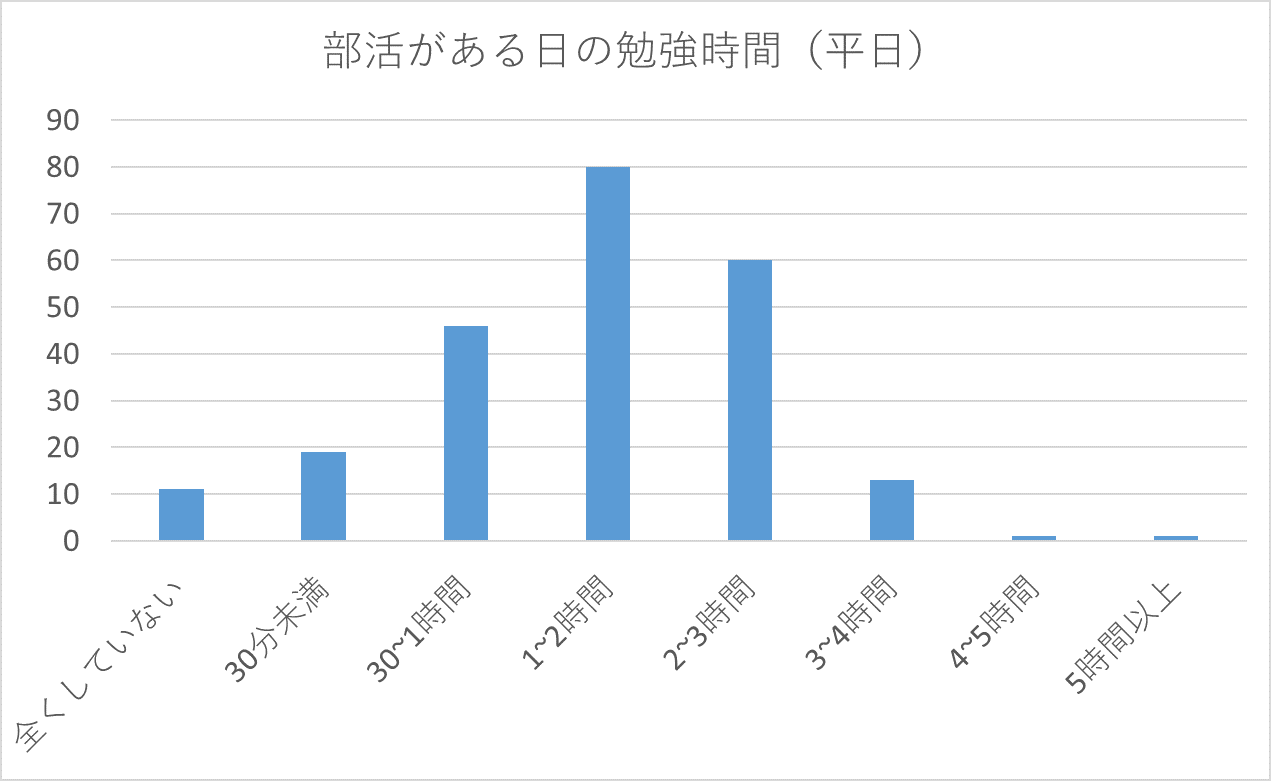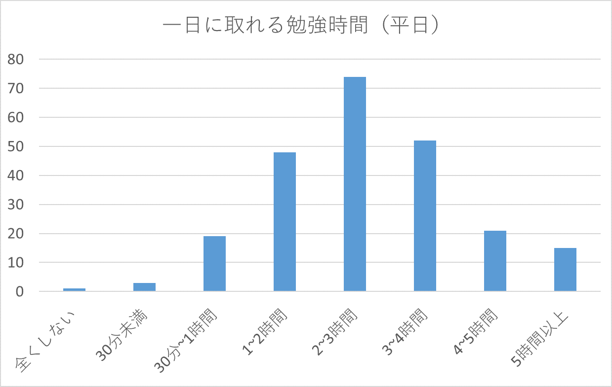 勉強時間について、部活がある平日の勉強時間は“一日に取れる時間”と、“実際に行っている時間”には大差がなく、少しだけ実際に取れる時間が長いくらいでした。