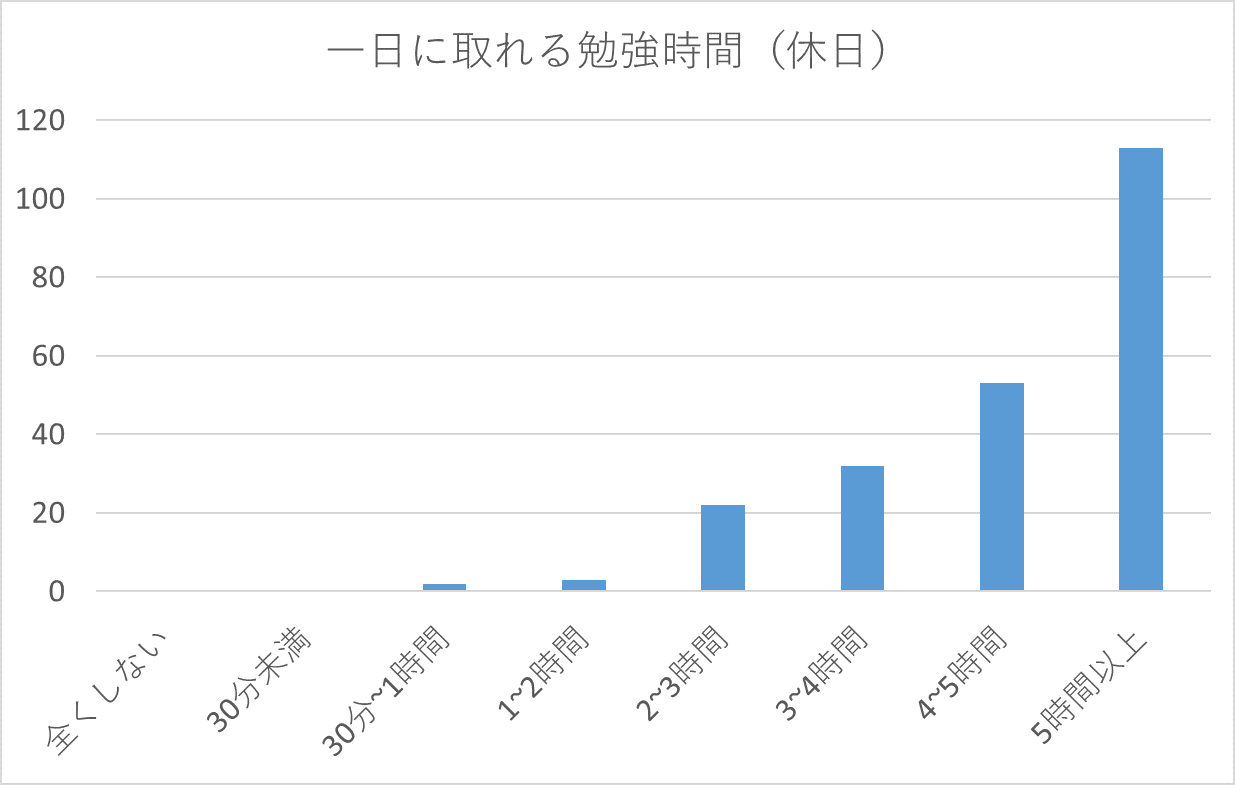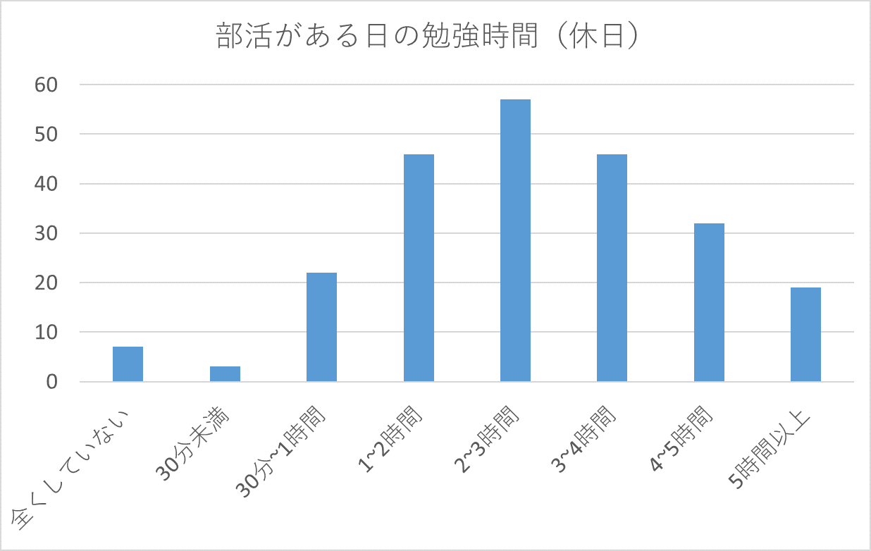 また、活動時間のグラフにもあまり広がりがなく、差がないように思います。しかし、休日に関しては、“1日に取れる時間”が5時間以上の人が大半ですが、実際は2~3時間程度しかできていない人がほとんどで、思ったように勉強できていないのではないかと思いました。活動時間のグラフを見てみると、1時間以下の人もいれば、なかには5時間以上の人もいました。休日の活動に各部活で大きな差があることが分かります。なので、休日に勉強ができない原因は部活が大変な人は部活が理由ですが、それ以外の人も何かしら平日にはできなかったことなど、自分のやりたいことに時間を当てているのかもしれないと思いました。