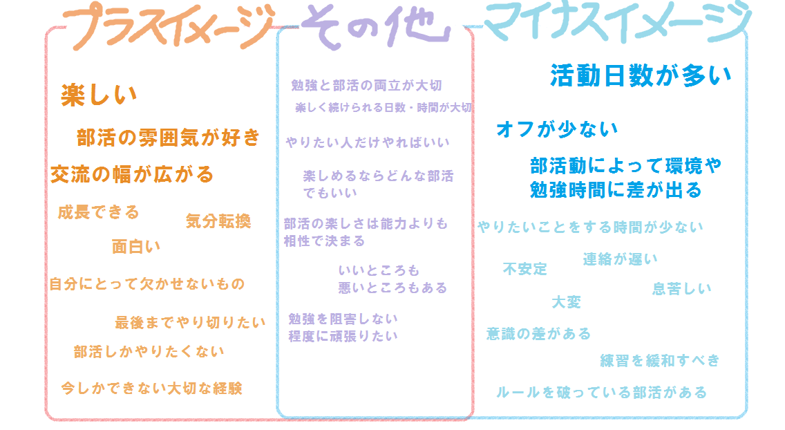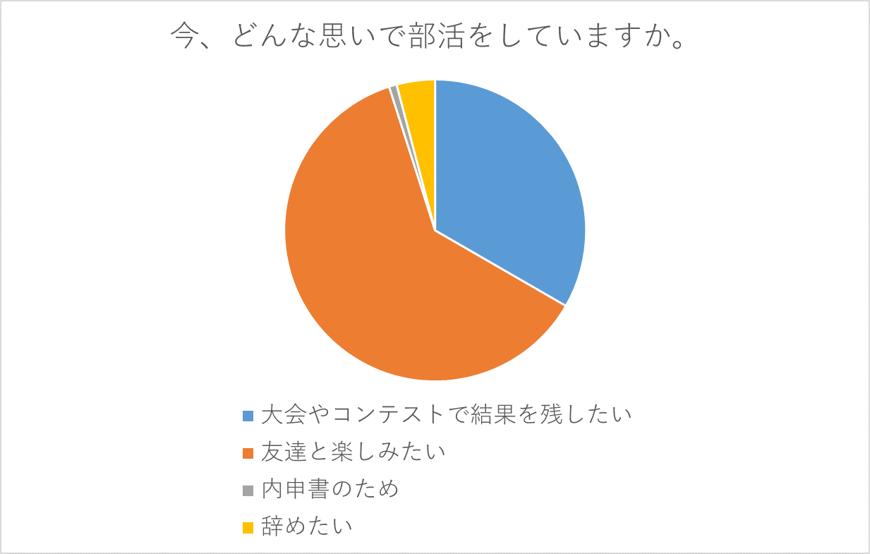 ですが、実際に不満を持って部活の制度を変えてほしいという人はほとんどいなかったので、大半の人が満足できているのかなと感じました。