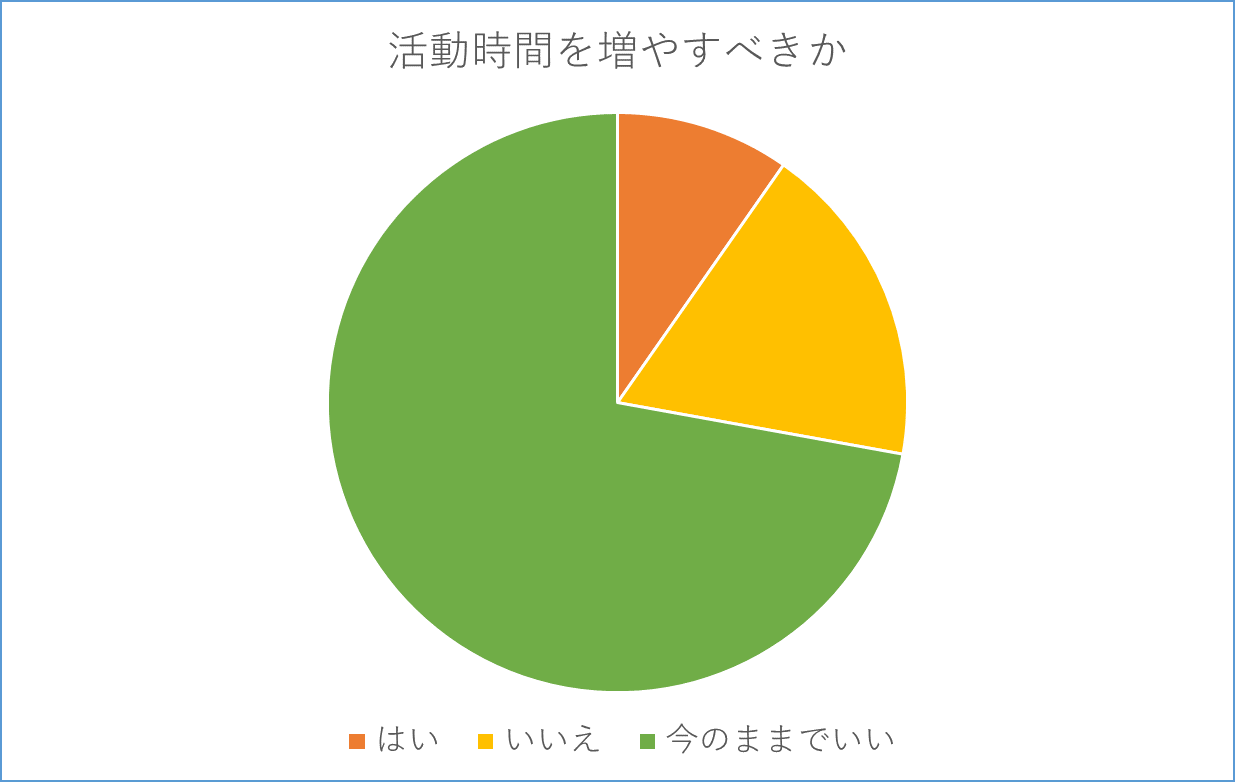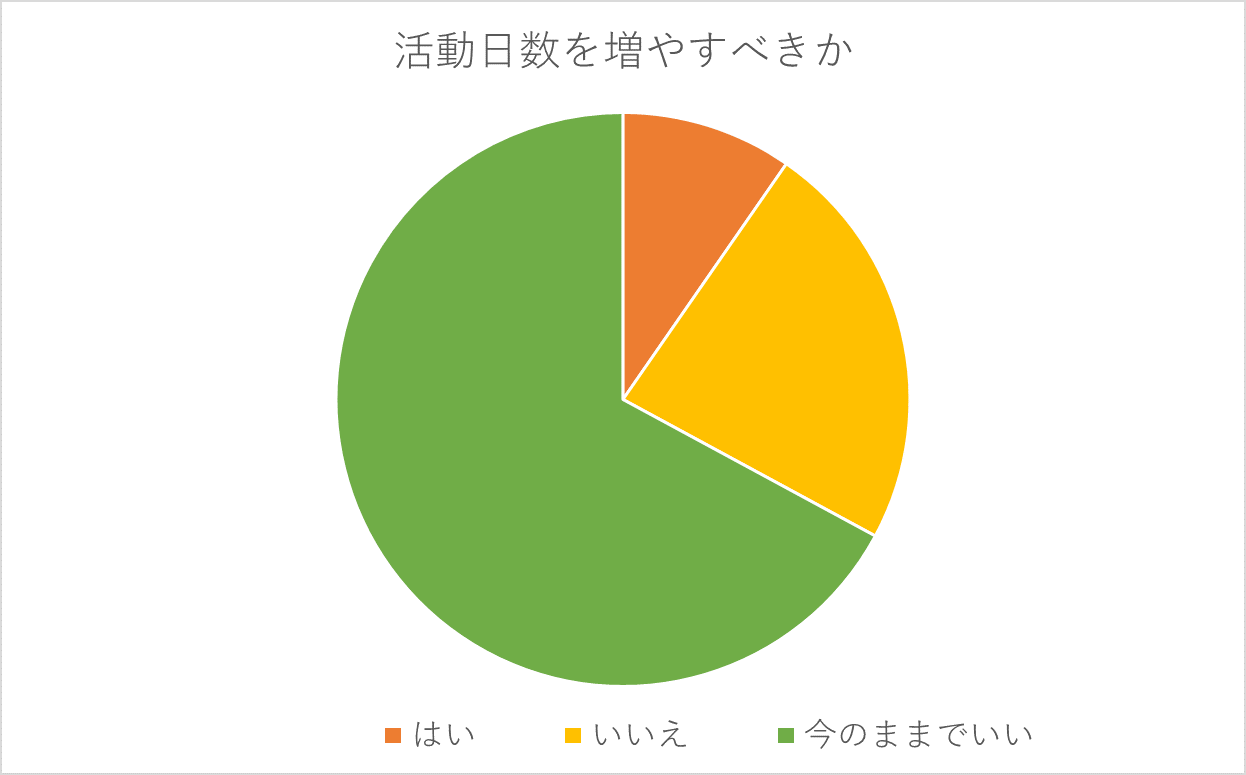 また、生徒の考える適切な活動時間は実際より1時間少ないほうがよく、活動日数は1日少ないほうがいいと答える人が多かったです。しかし、“増やすべきか”という質問に対しては、時間・日数共に“今のままでいい”と答える人が約70%という結果になりました。