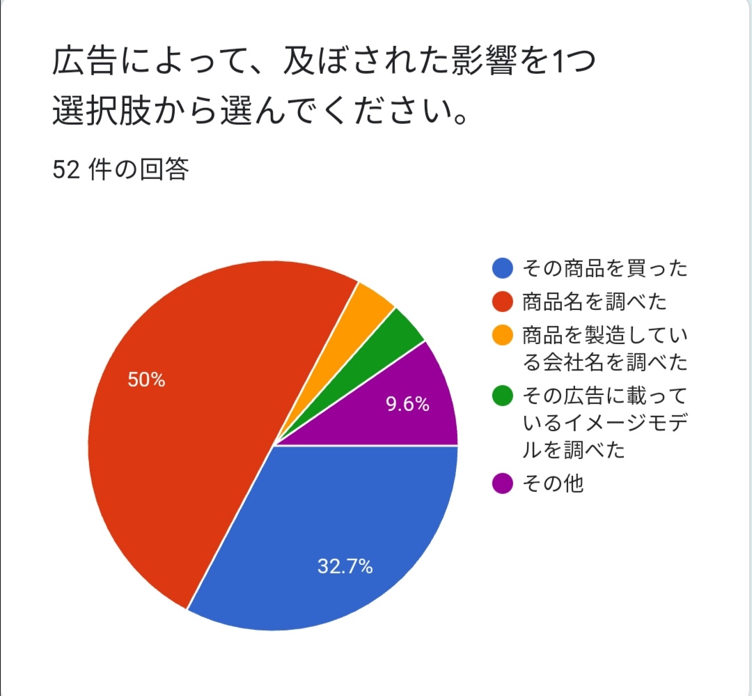 ・2位には、「その商品を買った」となりました。約30%の人がこの選択肢を選んだという結果が出たので、高校生には商品を広告で宣伝することは大きな影響があることがわかりました。