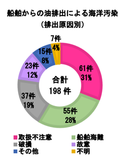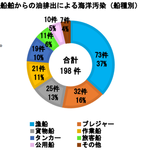 油による海洋汚染の299件のうち、船舶からの排出が198件で、船舶の船種別では漁船が最も多く、ついでプレジャーボート、貨物船、作業船、タンカーの順である。