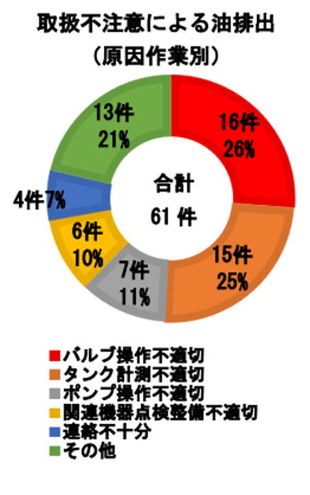 取扱不注意による油排出の原因作業は、バルブ操作不適切が最多で次いでタンク計測不適切。