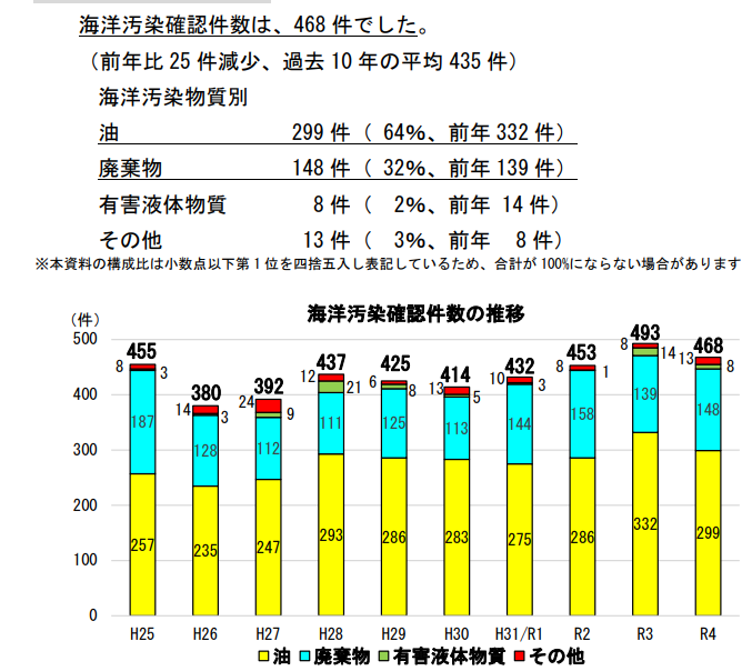 海上保安庁がまとめたデータでは2022年の海洋汚染発生件数が468件。