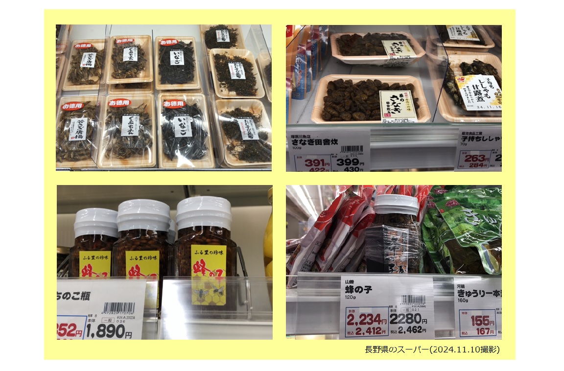 - A. イナゴやカイコの蛹の佃煮は特別なものではなく、日常的に食べていました。 蜂の子は栄養価が高く高価なものだったので大切に食べられていました。現在でも販売価格は高く、店頭では盗難防止アラームのタグが付いて陳列されています。
