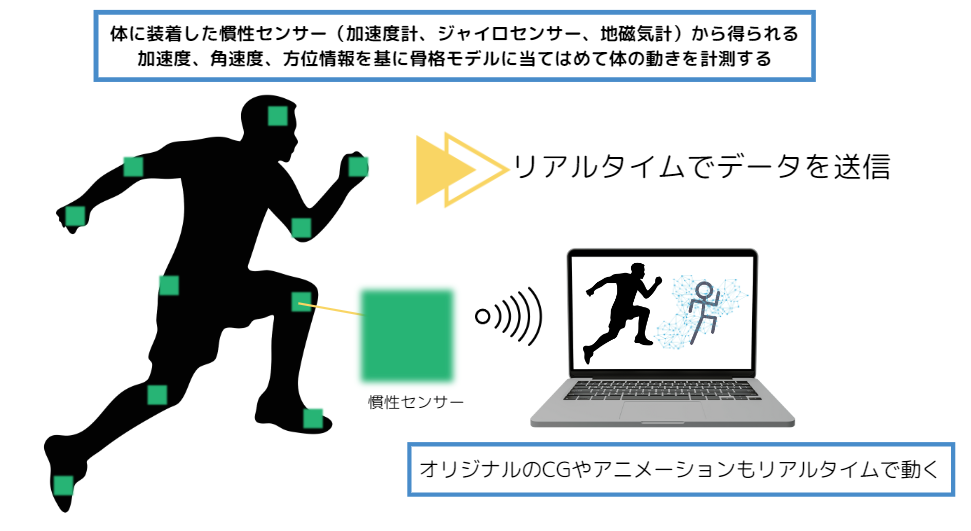 慣性式モーションキャプチャーは、体に装着した慣性の力を利用して動きを測定する慣性センサー(加速度計