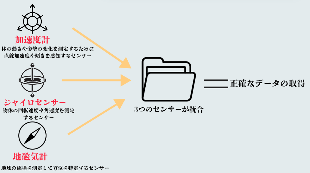 直線加速度や傾きを感知するセンサーのこと、ジャイロセンサー