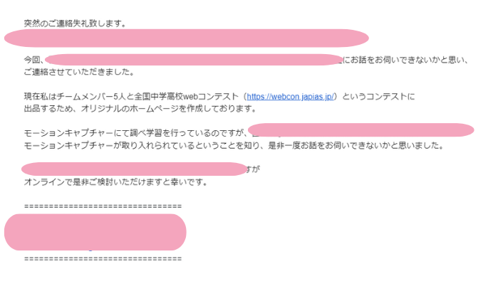 チームリーダーのS.Aです。夏休み前に取材先を探さないと焦ってきました。僕は取材先を探すのは、インターネットでいろんな企業様や大学、興味のあるものを探し、そのあとメールのお問い合わせから自分の名前、学校名を名乗り、返事をお待ちするかたちをとっています。基本は対面でお話を伺いしたいとお伝えし、遠方でお伺いするのは難しい場合はオンラインで交渉させていただきました。今回3つの大学と7つの企業様に連絡しました。お返事をいただけないこともありましたが、ほとんどの方にお返事をいただきとてもうれしかったことを書きたいと思います。ある企業様は、取引先関係の守秘義務がおありになることから取材は叶わなかったのですが、他社様をご紹介いただき、無事取材を受けていただけることになりました。どうしても取材させていただきたかった分野だったので、とてもありがたかったです。もうひとつは、取材できそうな感触だったこれも企業様の件です。結局は取材が難しいとご返答をいただいてしまったのですが、担当者様とはお電話でお話をさせていただきました。とても詳しく本当は取材させていただき当サイトに掲載させていただきたかったですが、僕にとってはとても貴重な経験でした。もしこのサイトを見てくださっていたらこの場を借りてお礼を言いたいと思います。本当にありがとうございました。