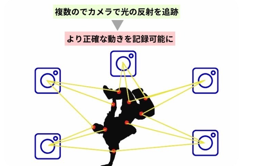 に反射素材で作られたマーカーを装着し、複数のカメラを使用してその動きを正確に捉える手法が採用されました。