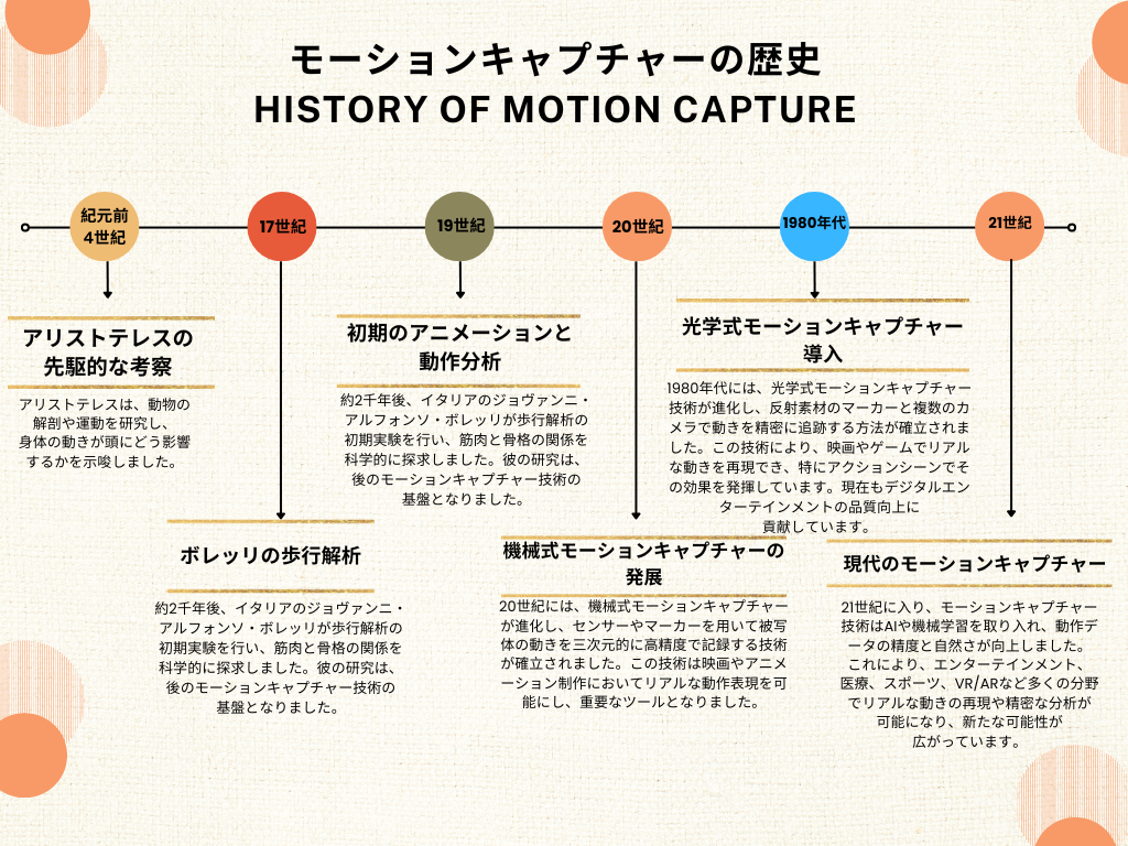 アリストテレスから始まるモーションキャプチャーの歴史を、主要な発展を交えて説明します。