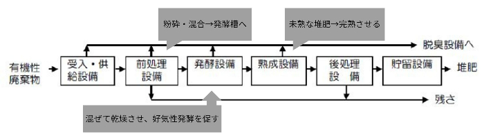 2)堆肥化技術…微生物などが生育やエネルギー代謝のために酸素を必要とする状態(好気性雰囲気下)で、微生物のはたらきを利用し、生ゴミを分解し、堆肥を生産する技術です。食品残渣を堆肥や肥料としてリサイクルすると、土壌が豊かになり美味しい農作物を育てられる点がメリットです。地域内で飲食店や農家、リサイクル事業などが連携し、リサイクル活動で作られた農作物を飲食店で使用すると、*循環型社会*の形成に貢献します。一方で、微生物で発酵させるための設備投資にコストがかかることや、農家たちの信頼を得られないと、使用されることが少なくなることがデメリットです。