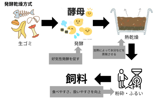 1)飼料化技術…基本的には、脱脂・乾燥などによる低水分化が主体で、生ゴミを熱加工・乾燥処理等・油脂分調整により、粒状の飼料を生産する技術です。また、粒状ではなく液体状にするときには、資源化可能な食品廃棄物と水を混ぜて成分・水分調整を行い、液状にして豚に餌を与える技術を利用しています。もともと家畜飼料は輸入依存度が高く、飼料自給率は低い状況です。ここで飼料化技術を利用すると、飼料自給率の向上や国産飼料での畜産経営が可能になります。しかし、処理工程で異物混入が発生しやすく品質管理が難しい点が、デメリットです。